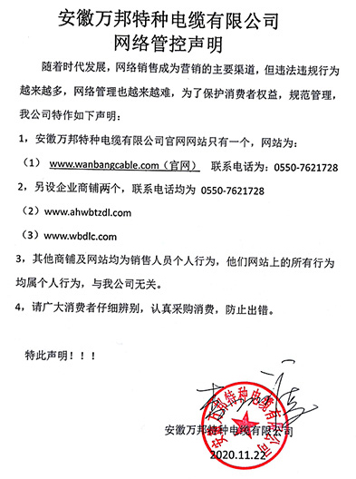 鄭重聲明:安徽萬邦特種電纜有限公司官方網站為:www_wanbangcable_com.qdhwx.cn,除此之外無任何子網站或合作網站,其余均為假冒偽劣。電話:0550-7621728 13485756353 地 址:安徽省天長市滁州高新技術產業開發區經四路29號